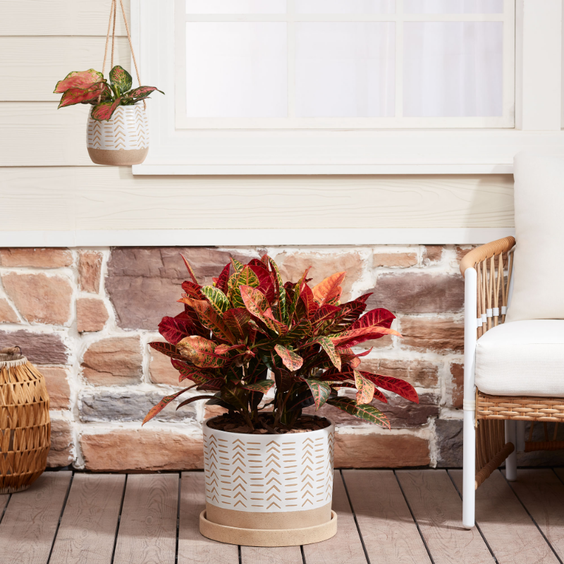 Greenery, cacti, and other colorful plants complement the brown and white colors