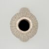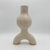 This unique ceramic dried flower vase features donut shaped legs and a bulbous body, and its fluted vertical stripes add texture and dimention to this one-of-a-kind piece. Made with brown speckled clay using a combination of wheel throwing and hand-building, and dipped in oatmeal (off-white)-colored glaze that allows the natural speckles from the sand in the clay to show through. The bottom rim of the vase is left unglazed. Dishwasher and microwave-safe. Please note that this vase is open on the bottom of the legs, so can’t hold water – it’s made for displaying dried botanicals, or even a small air plant.