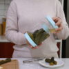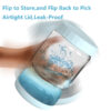 100% leakproof Hourglass Flip Holder: Airtight Lids with silicone seal keep food fresh, and is 100% leakproof. Just flip and grab,and then flip over again to store. No sticky or stinking fingers. No wet dill chip pickles on your sandwich and Hamburger